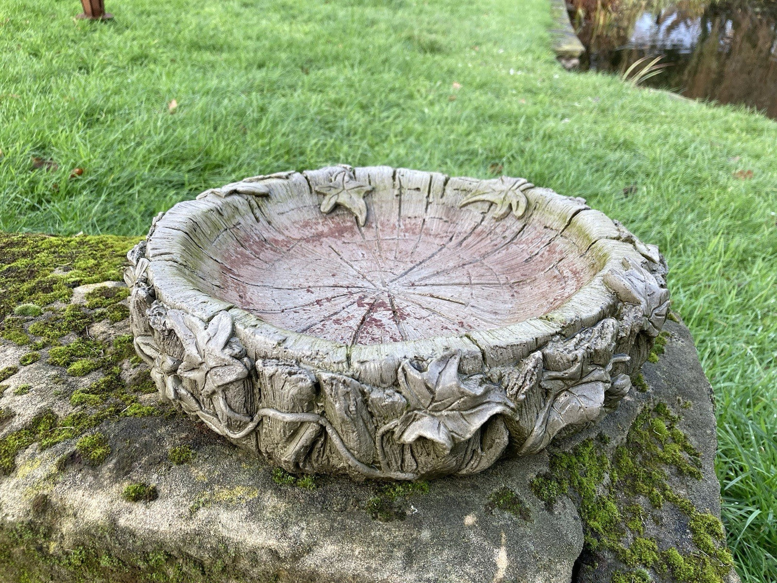 Aged reconstituted stone garden Ivy Bird Bath ornament