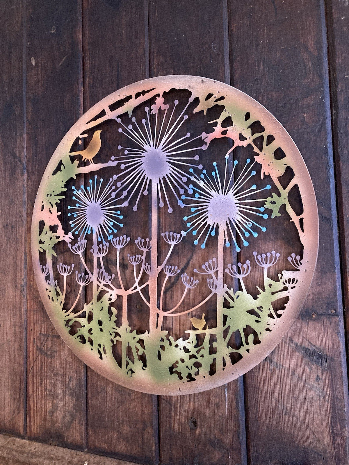 COLOURED METAL BIRD & ALIUM FLOWERS GARDEN WALL PLAQUE