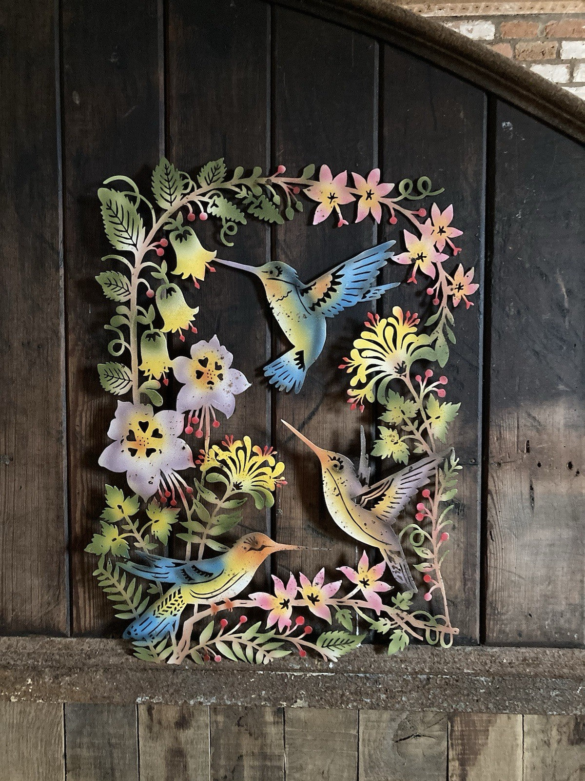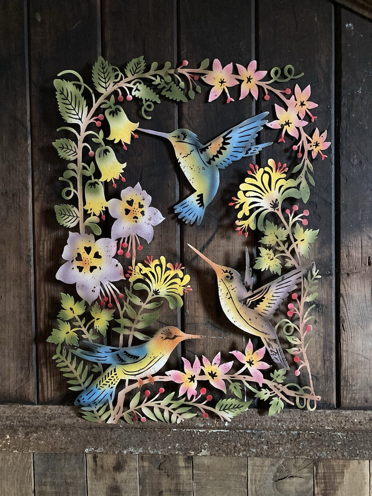 Coloured Metal Hummingbirds & Flowers Wall Plaque