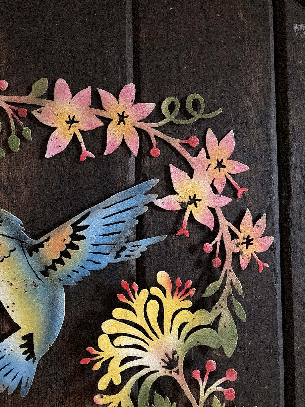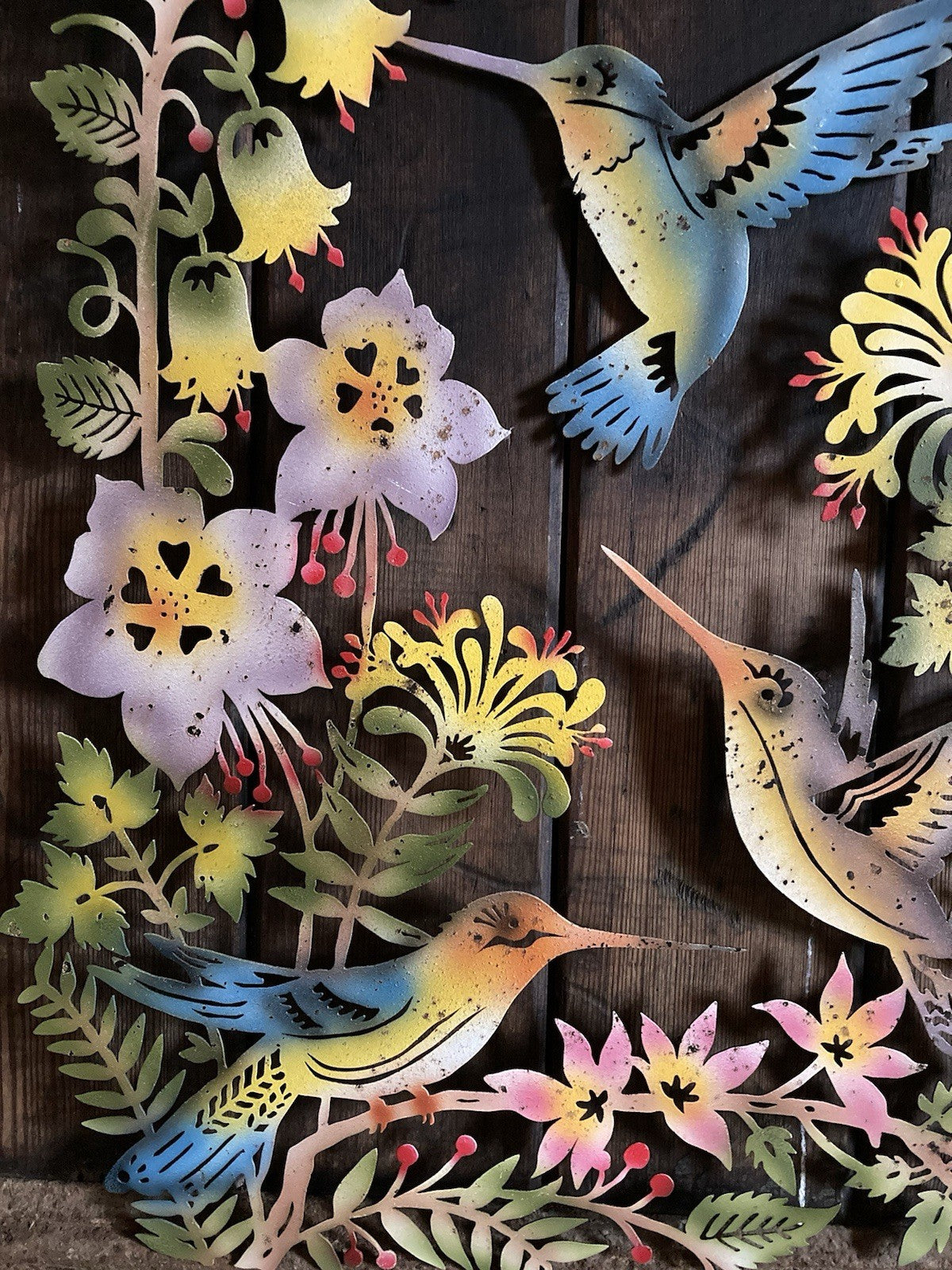 COLOURED METAL HUMMINGBIRD / FLOWERS WALL PLAQUE HANGING GARDEN ORNAMENT