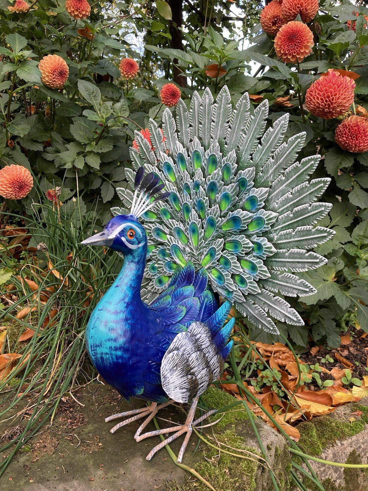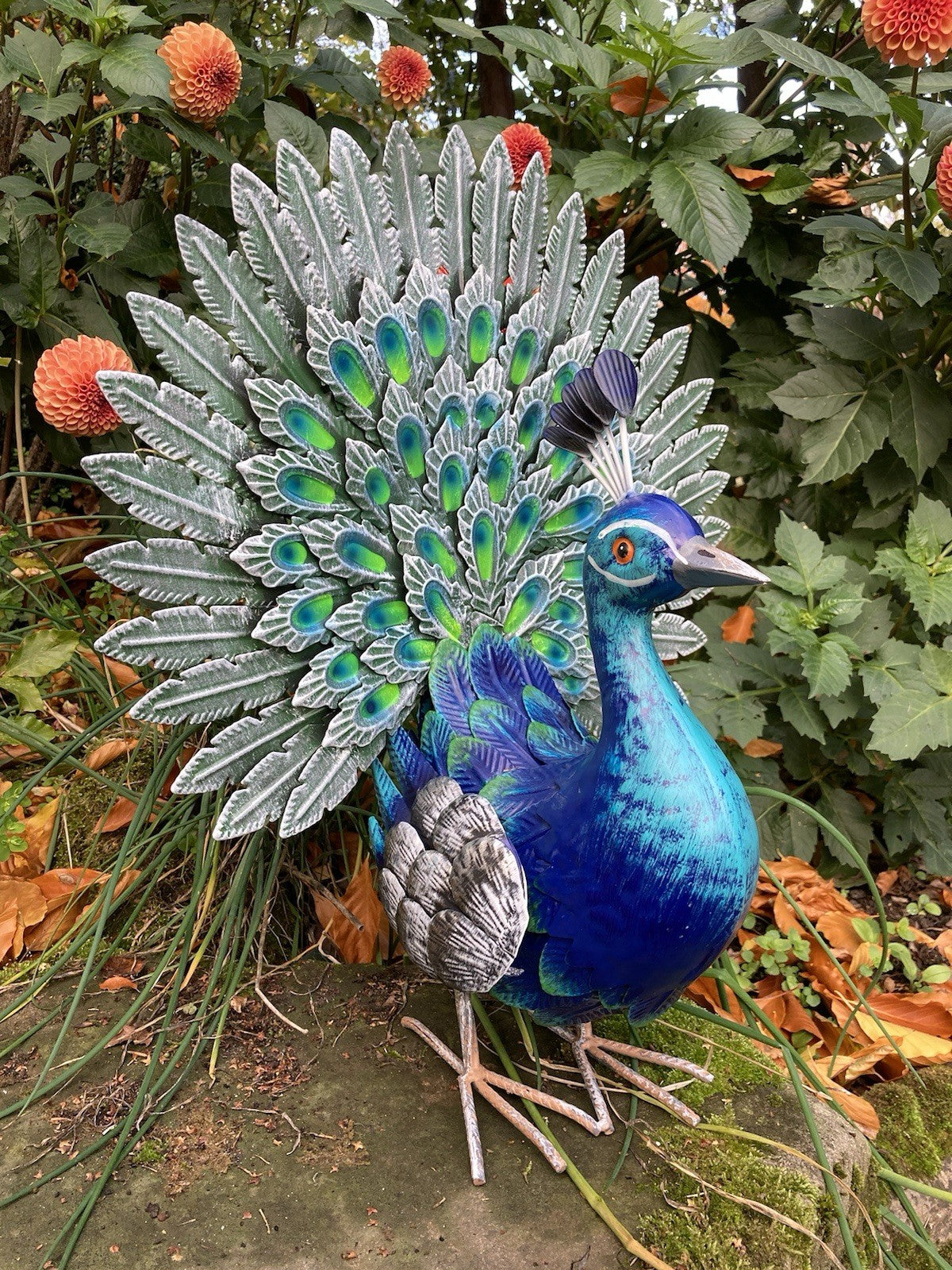 COLOURED METAL PEACOCK BIRD STATUE GARDEN ORNAMENT