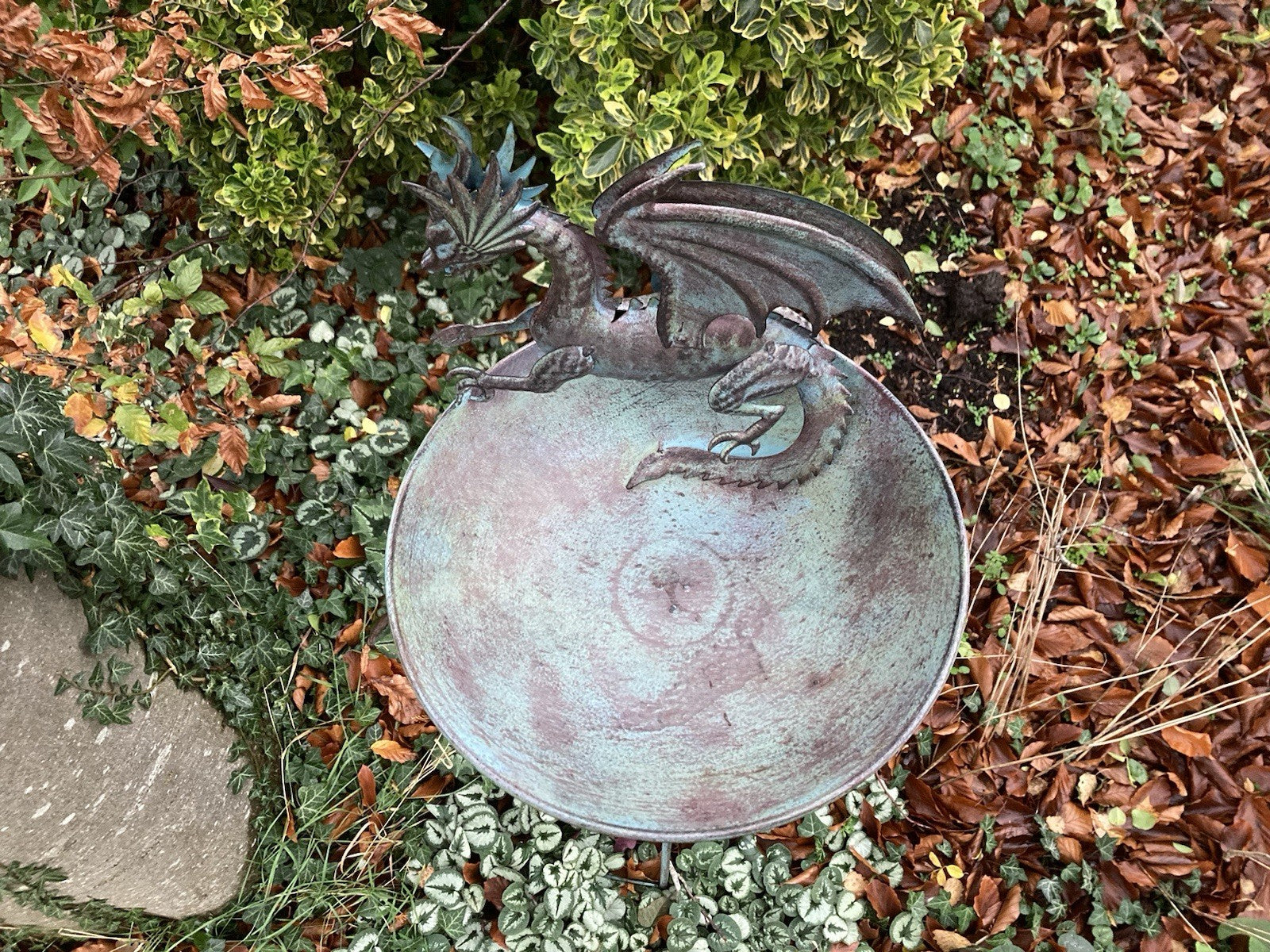 METAL BLUE DRAGON BIRD BATH / FEEDER STAKE GARDEN ORNAMENT