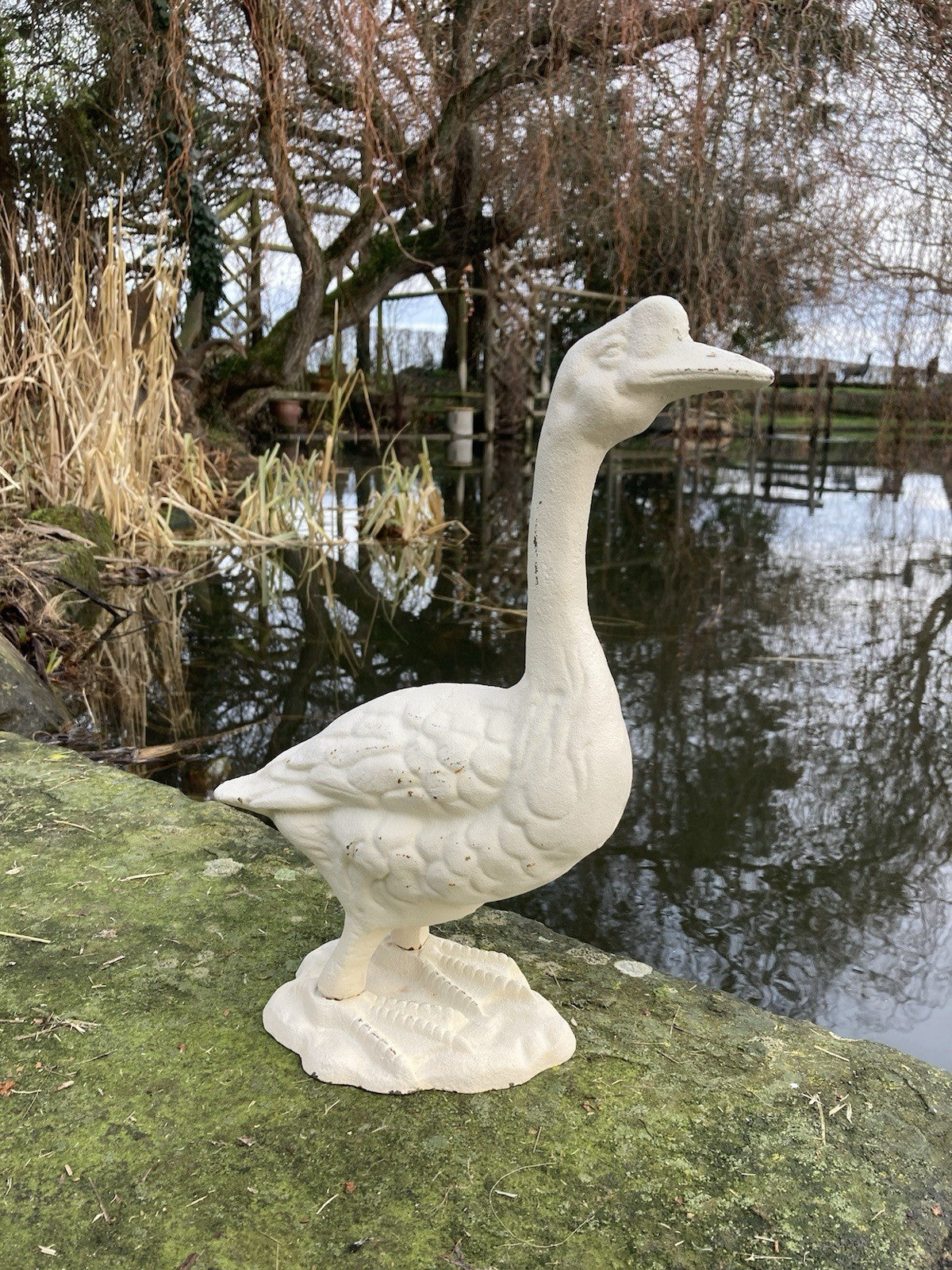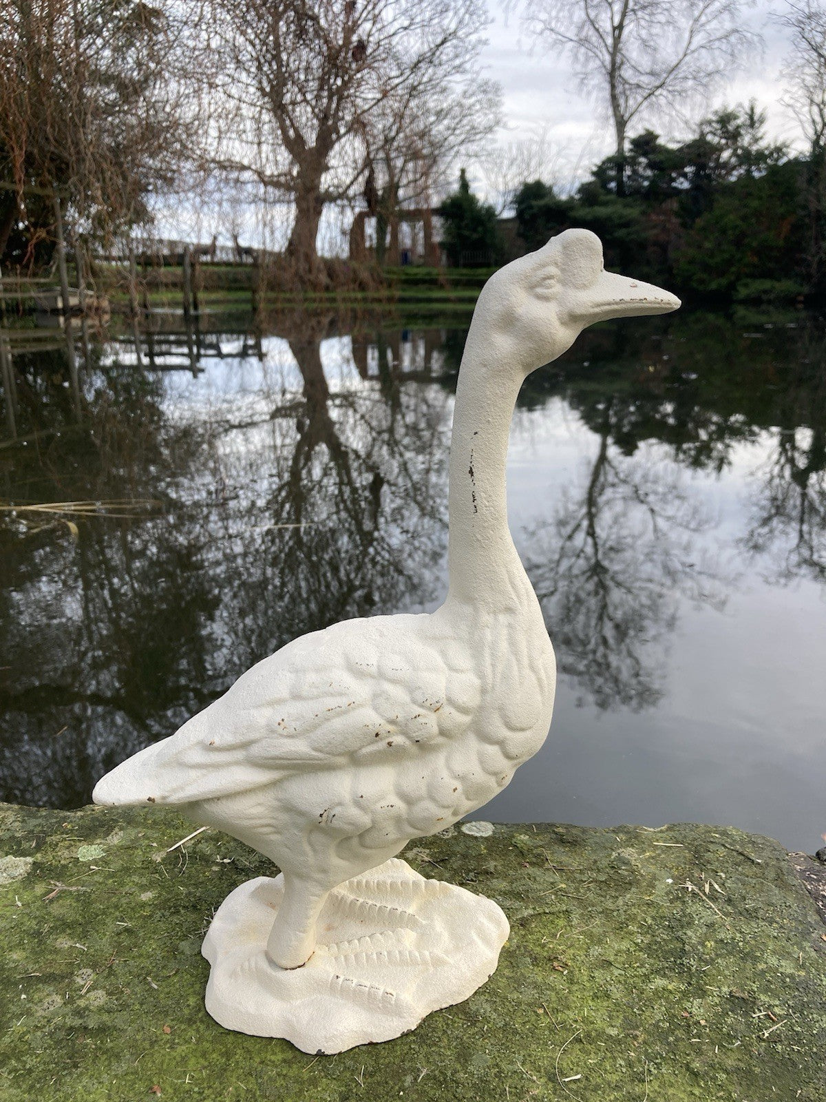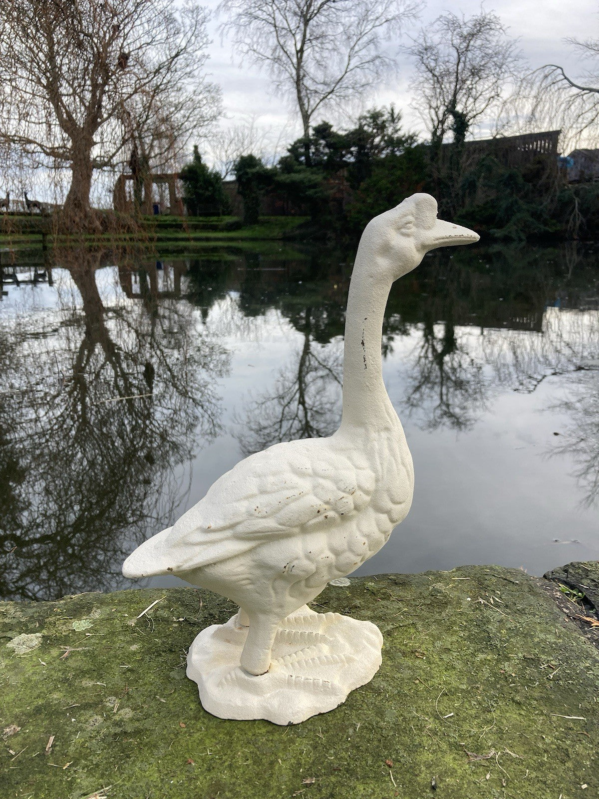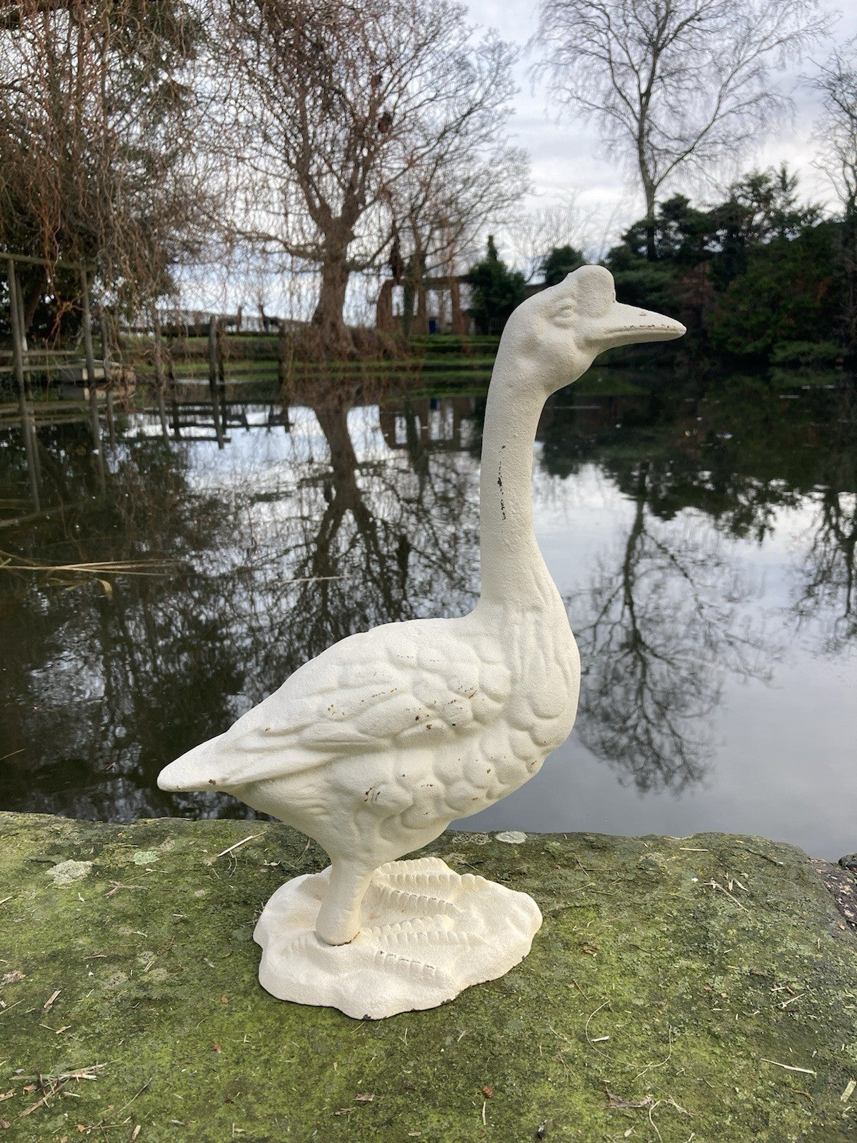 RUSTIC METAL CAST IRON WHITE GOOSE - BIRD STATUE GARDEN ORNAMENT