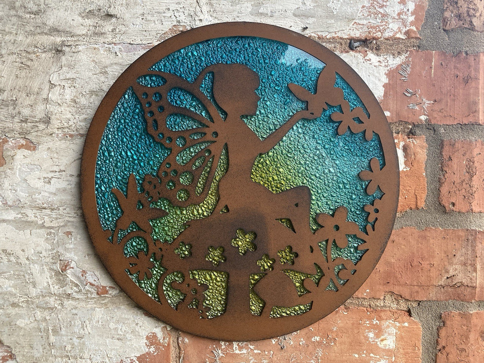Metal Fairy Silhouette Wall hanging Plaque with coloured acrylic backing.