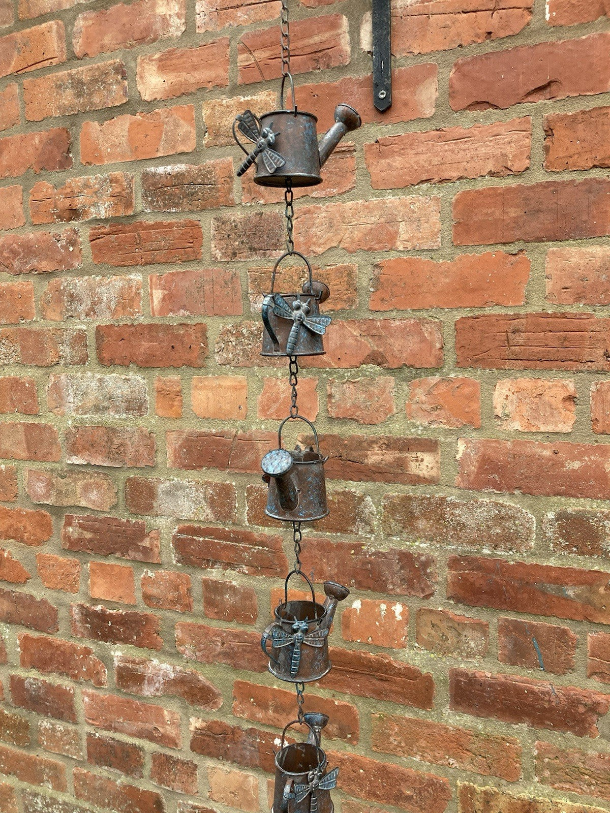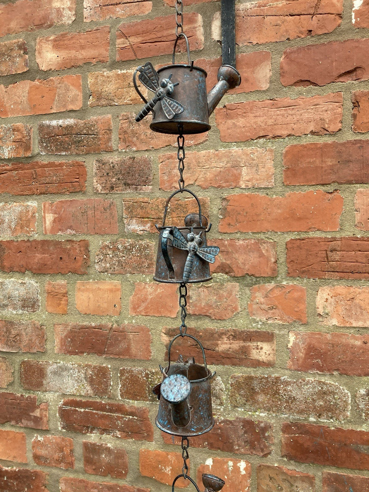Blue Metal Hanging Watering Can / Dragonfly Bell Rain Chain