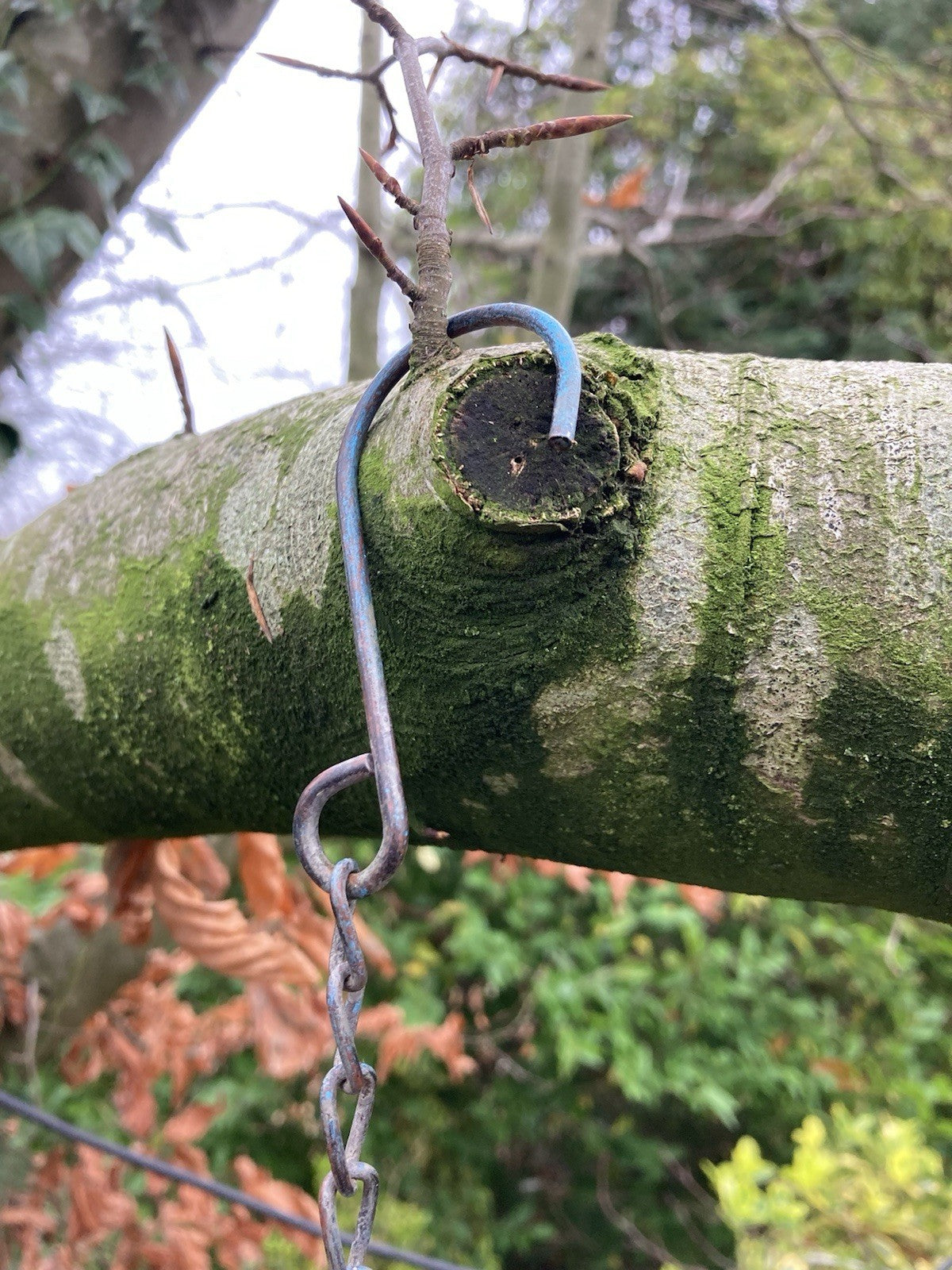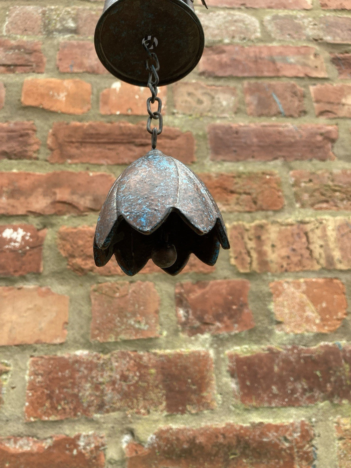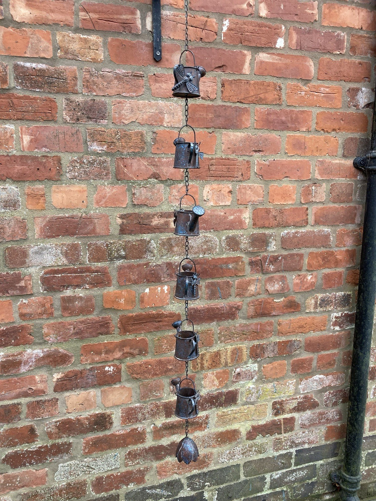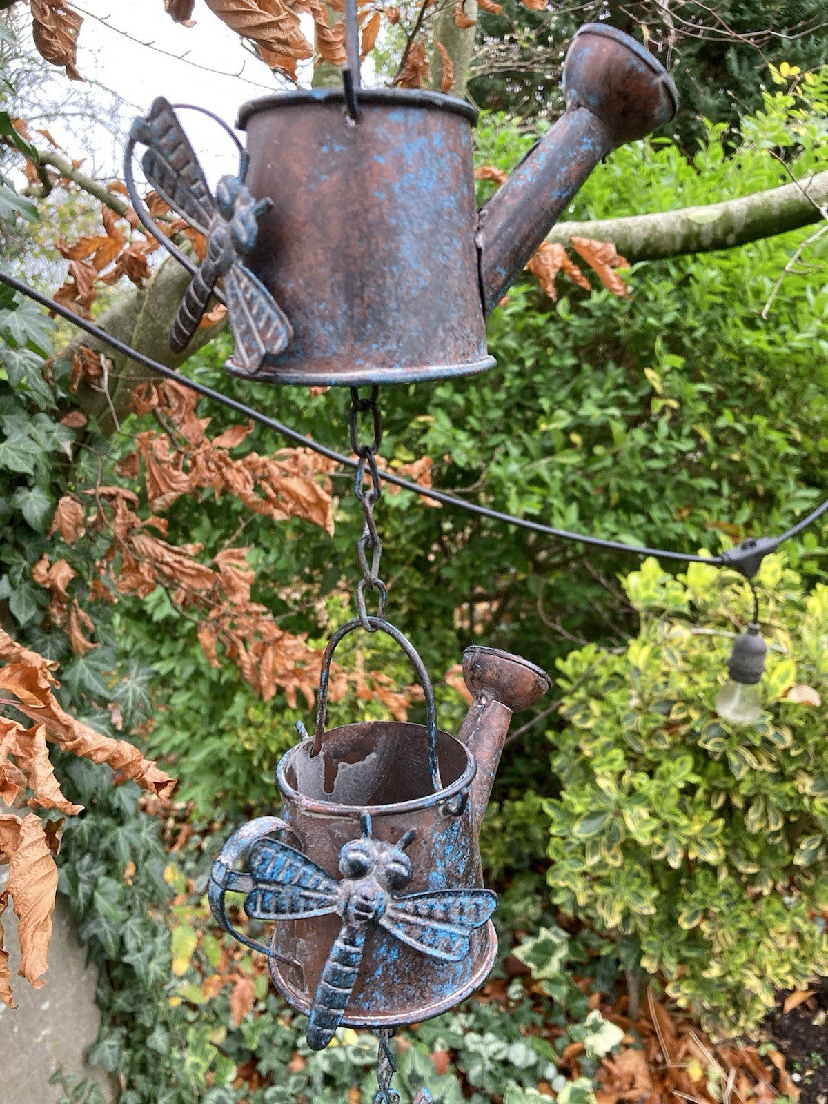 BLUE METAL HANGING WATERING CAN / DRAGONFLY BELL RAIN CHAIN GARDEN ORNAMENT