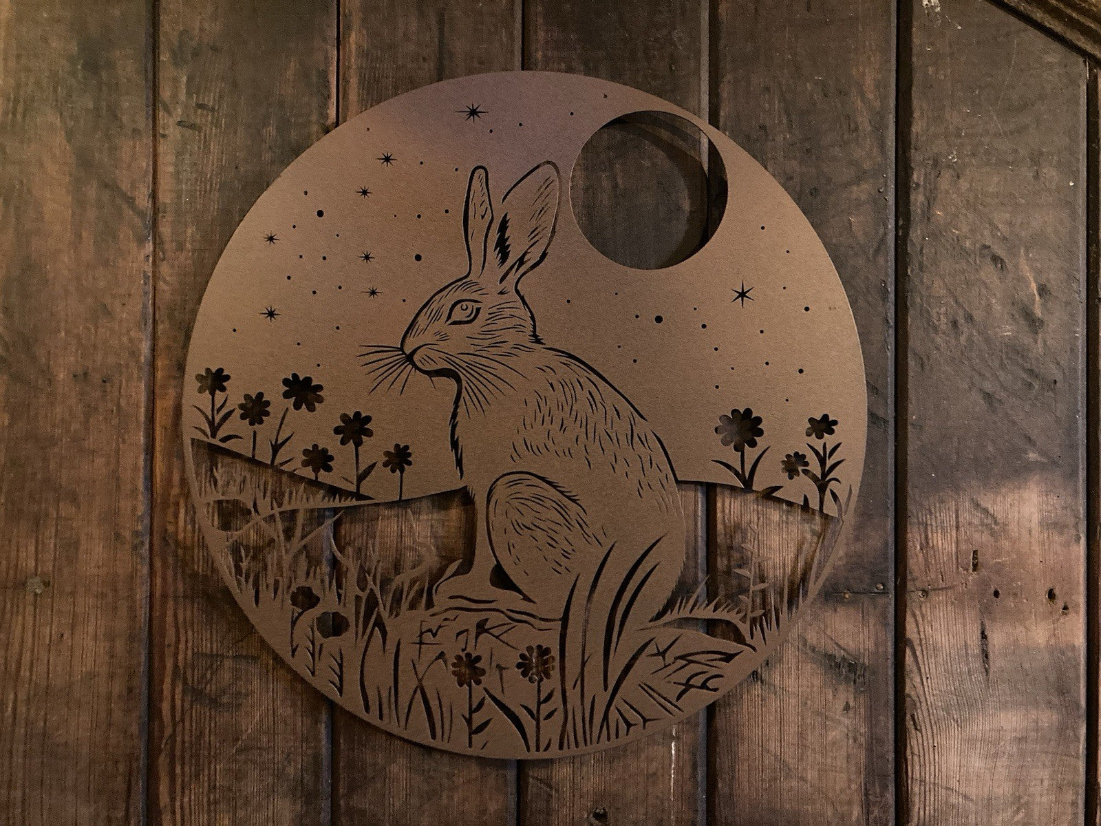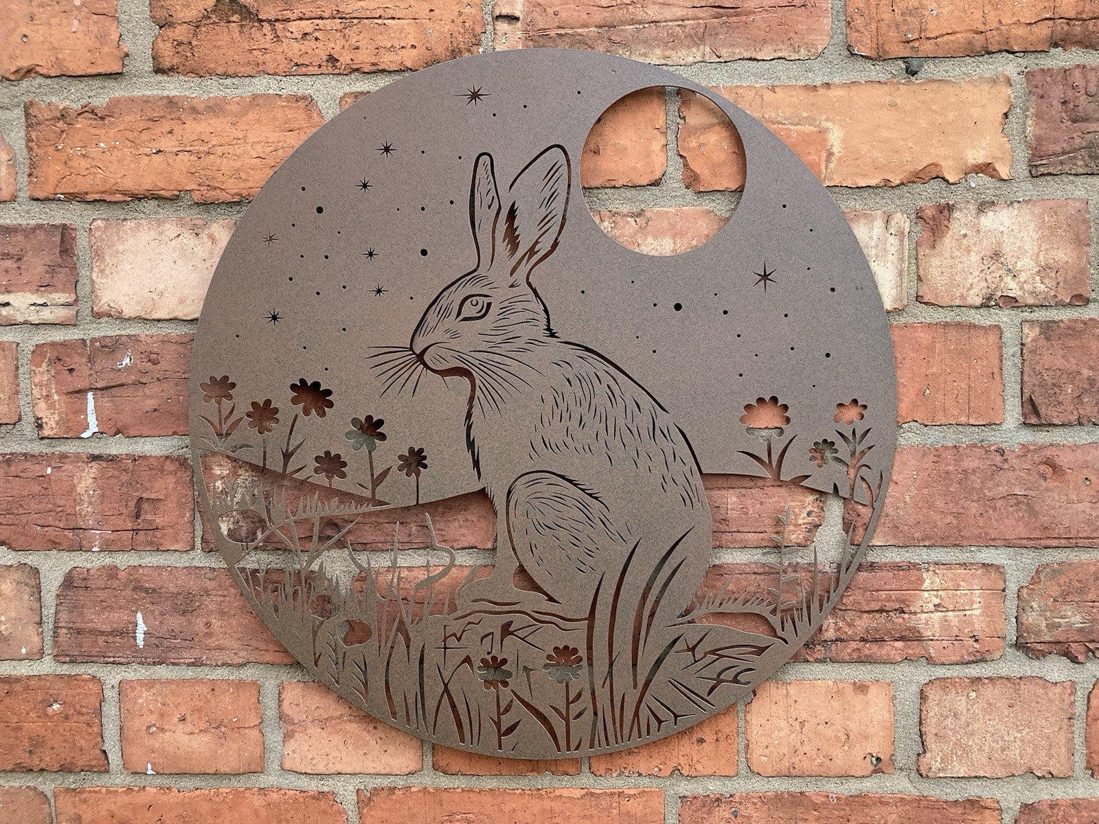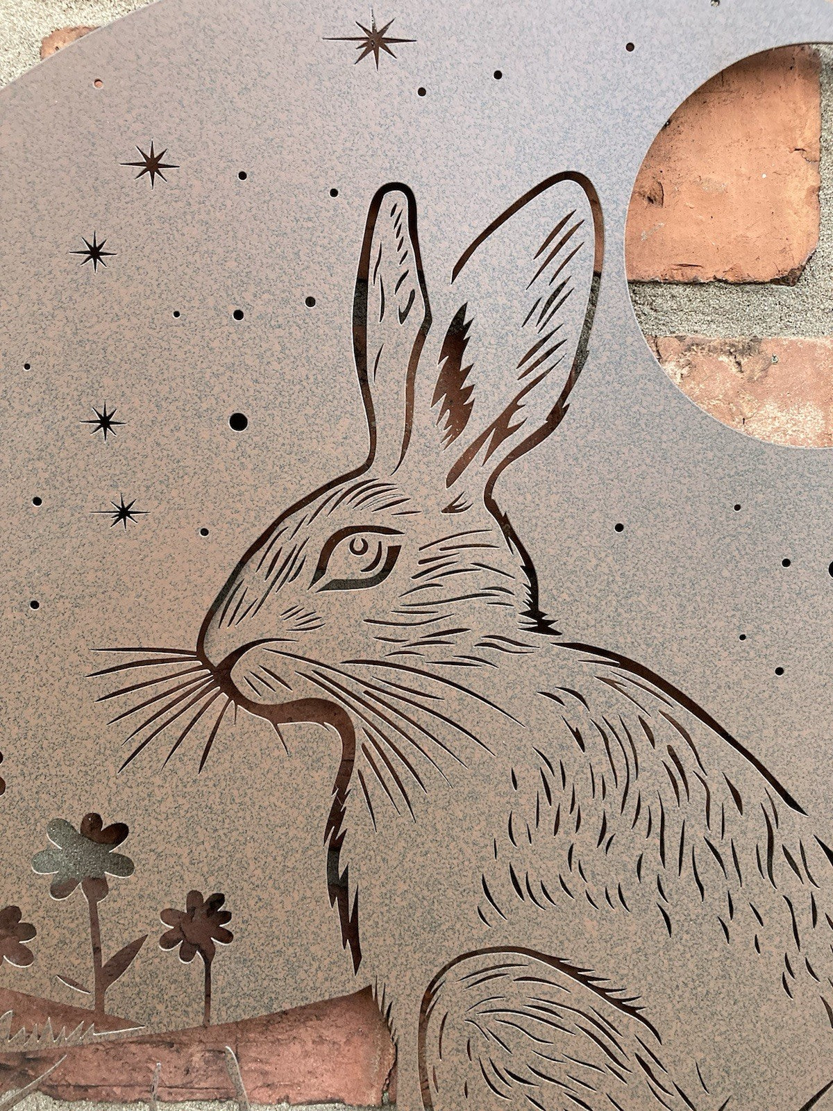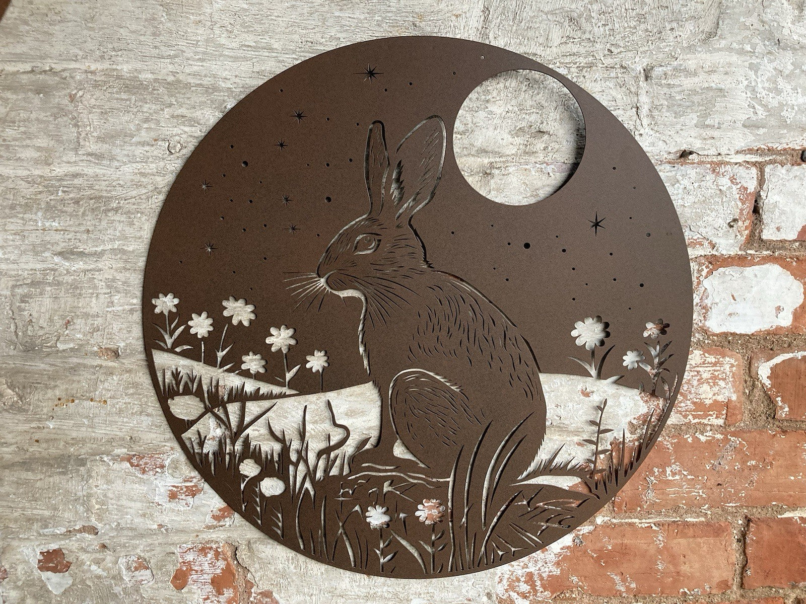 BROWN METAL HARE & MOON WALL ART GARDEN PLAQUE
