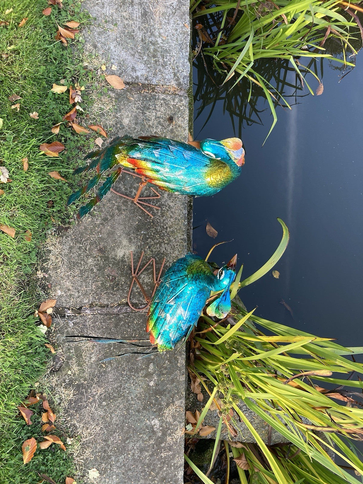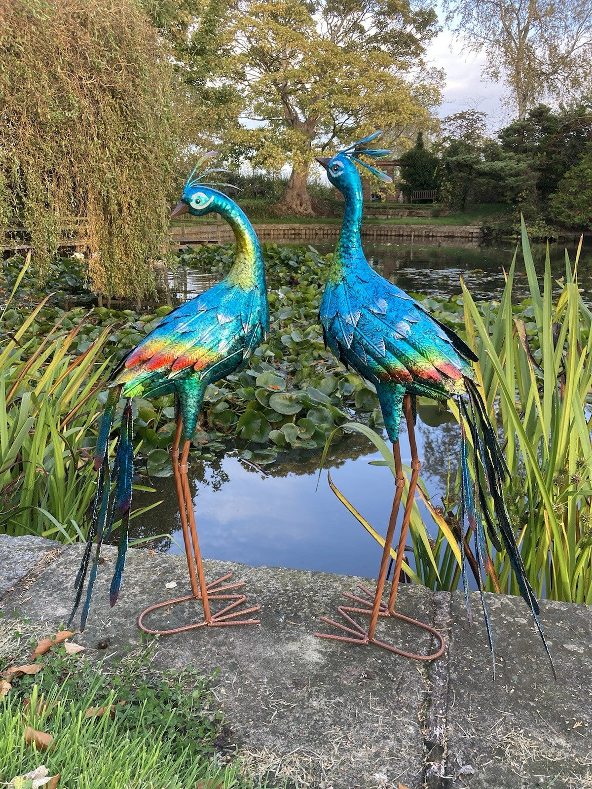PAIR OF COLOURED METAL PEACOCKS BIRD STATUE GARDEN ORNAMENTS