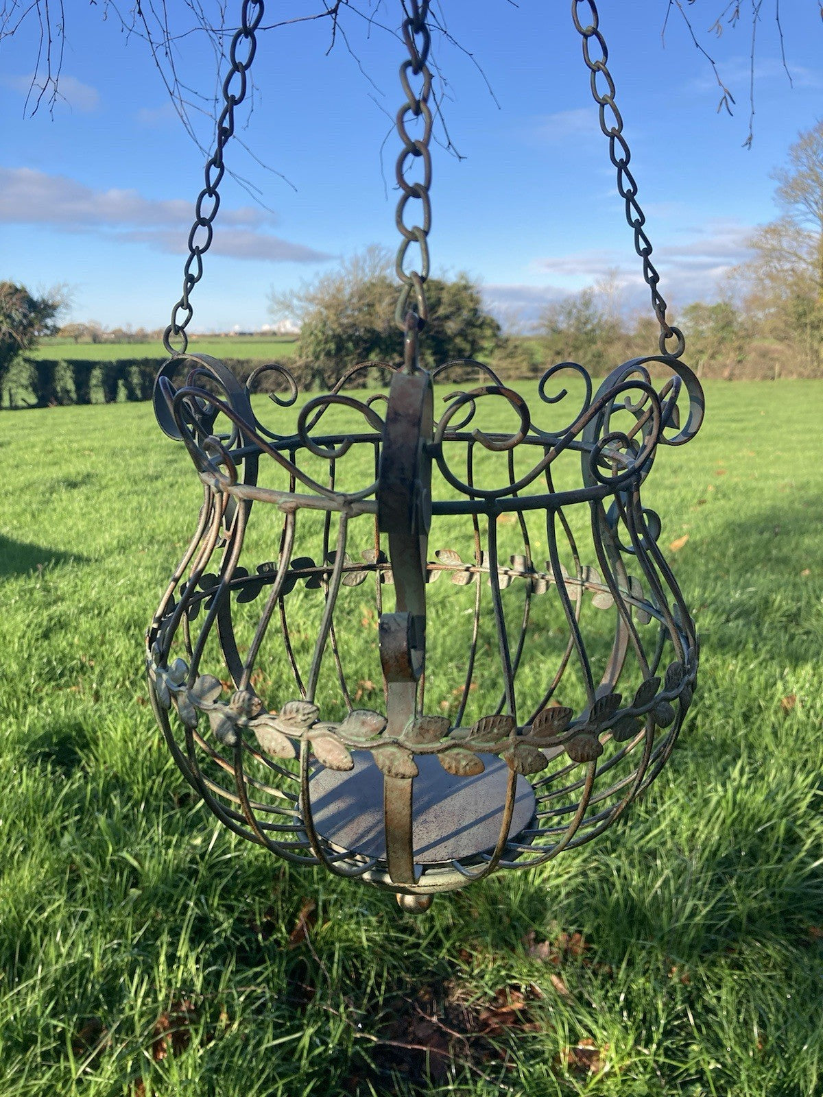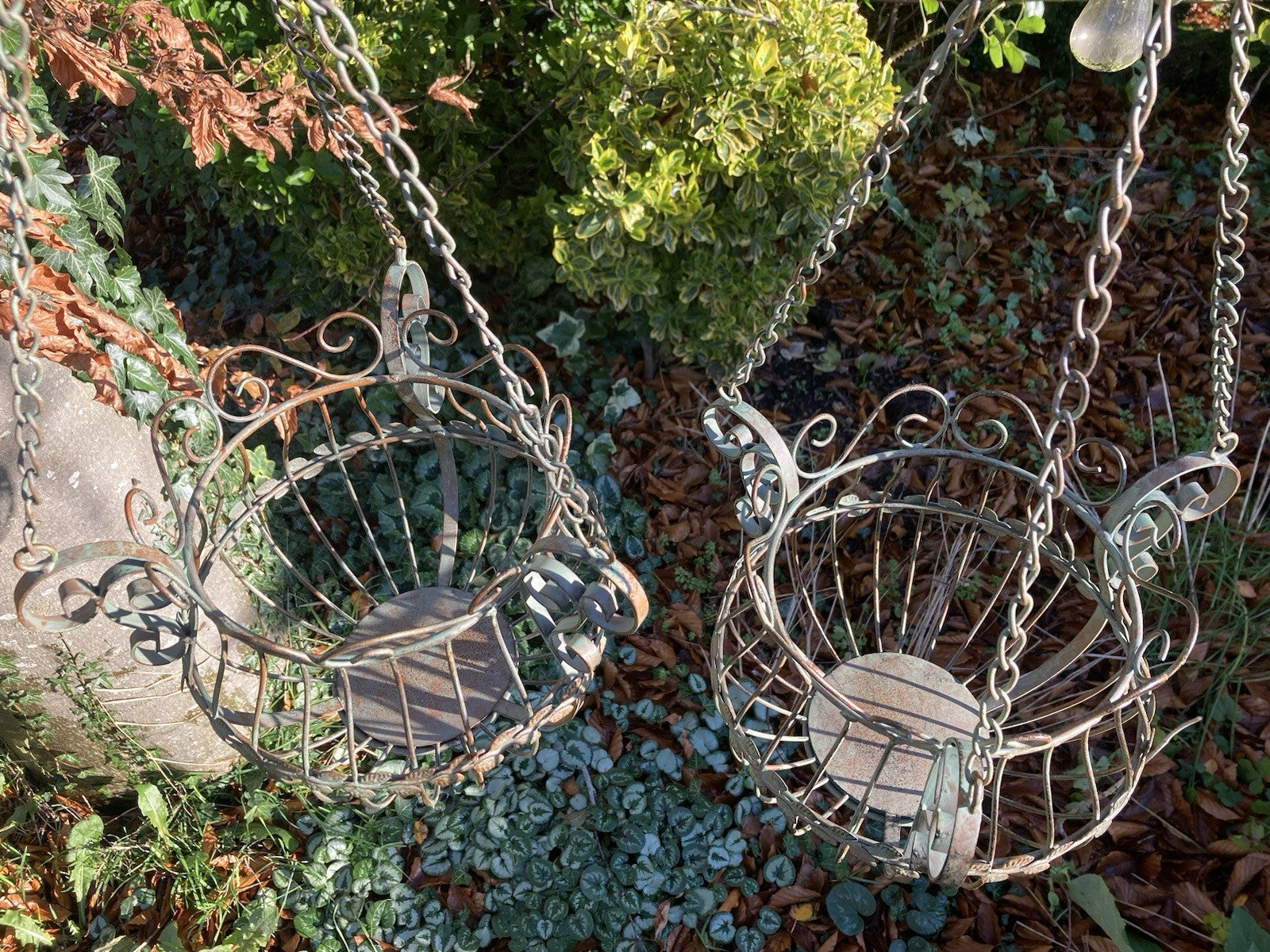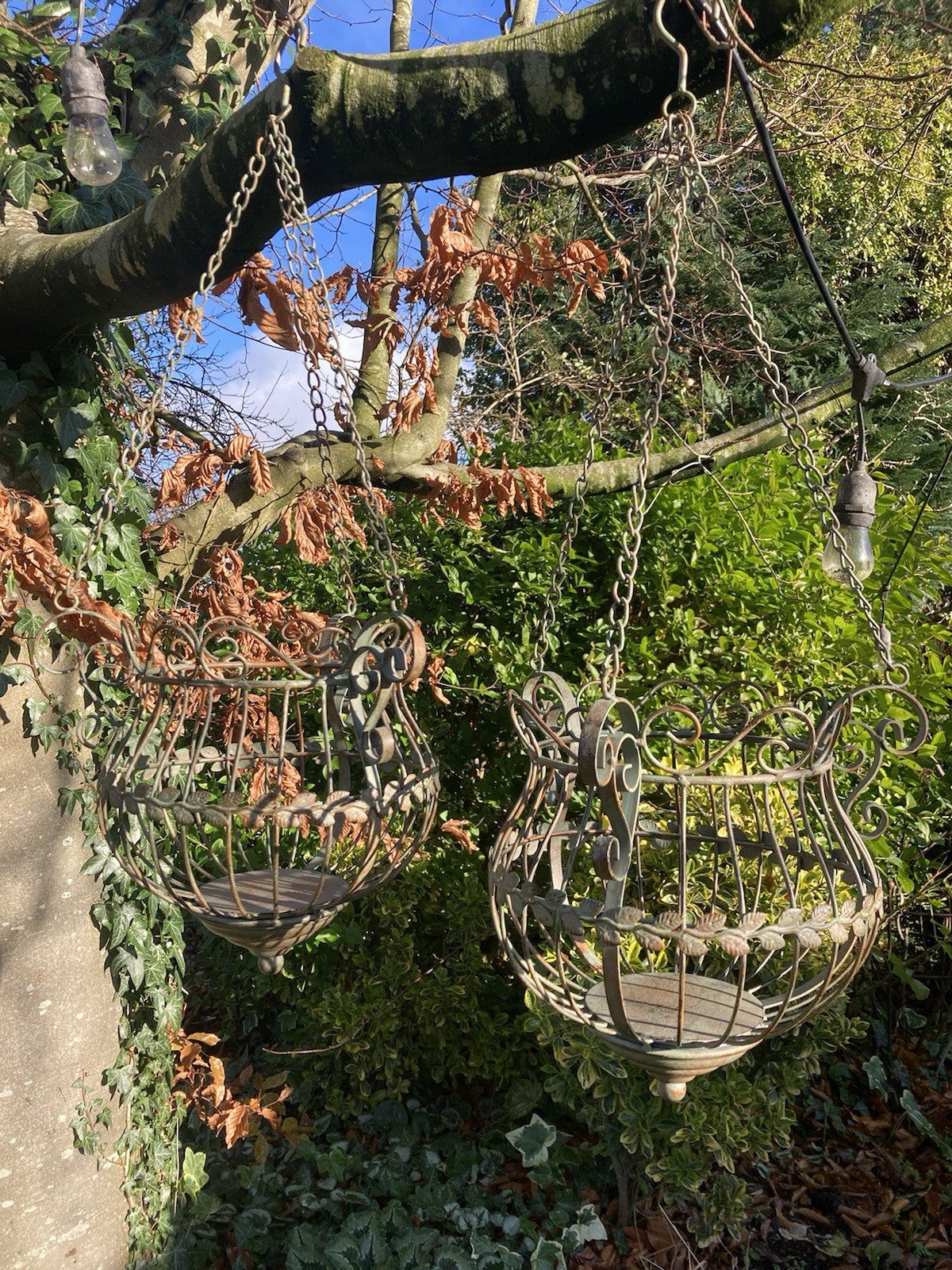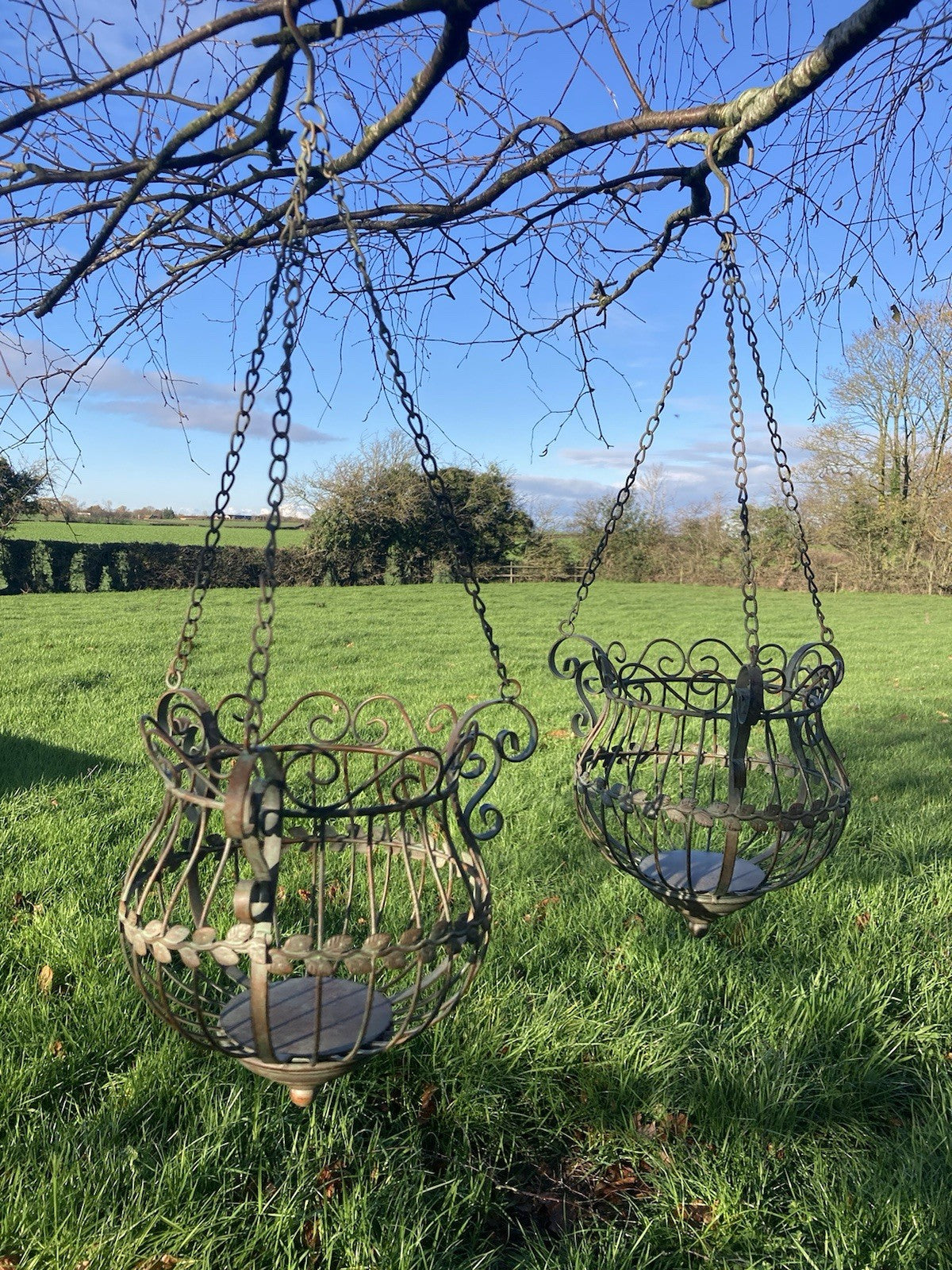 PAIR OF GREEN METAL HANGING BASKETS PLANTERS FLOWER / GARDEN DECORATIONS