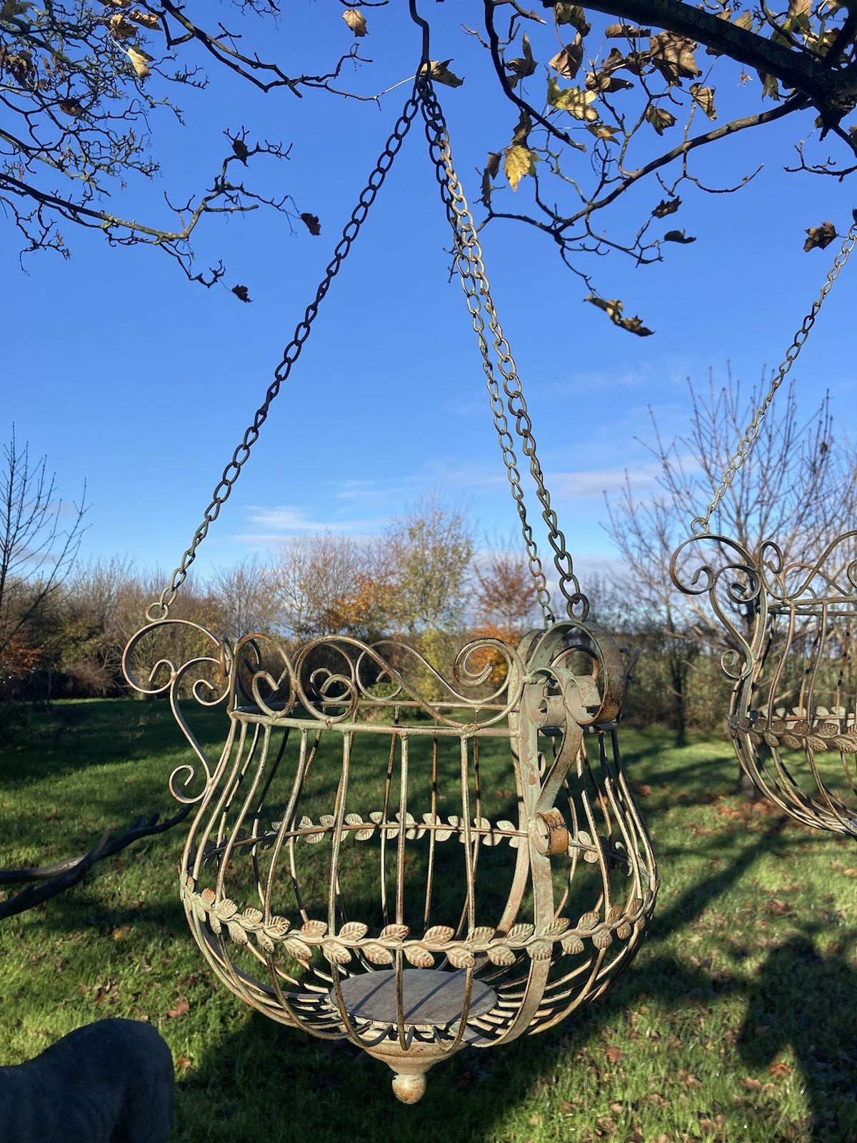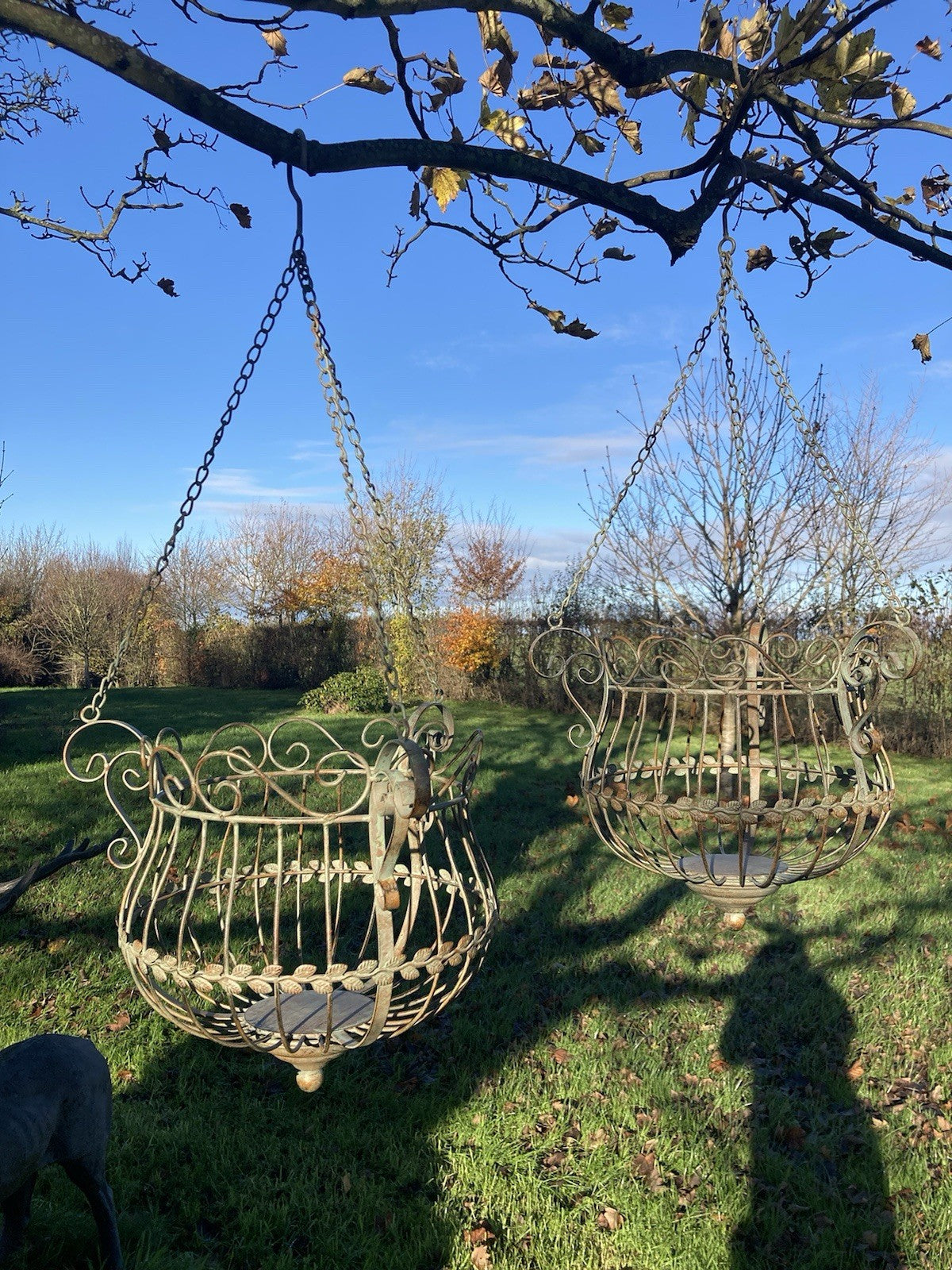 PAIR OF LARGE GREEN METAL HANGING BASKETS PLANTERS FLOWER / GARDEN DECORATIONS