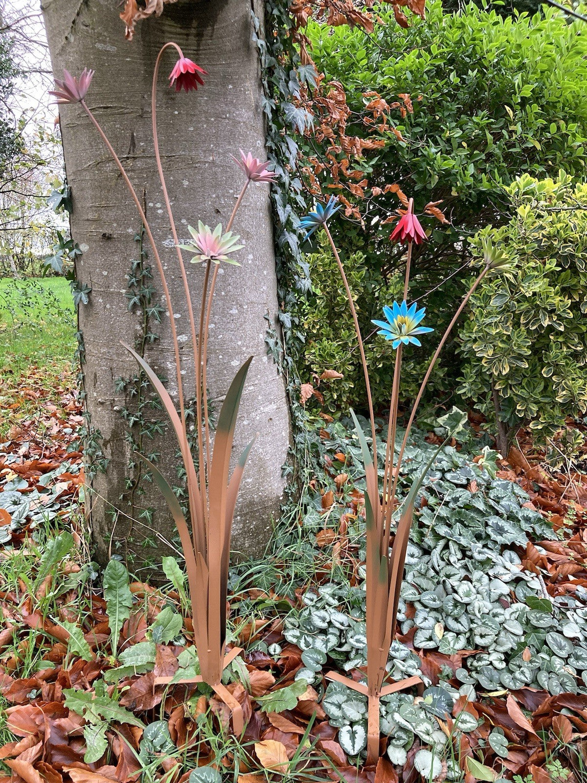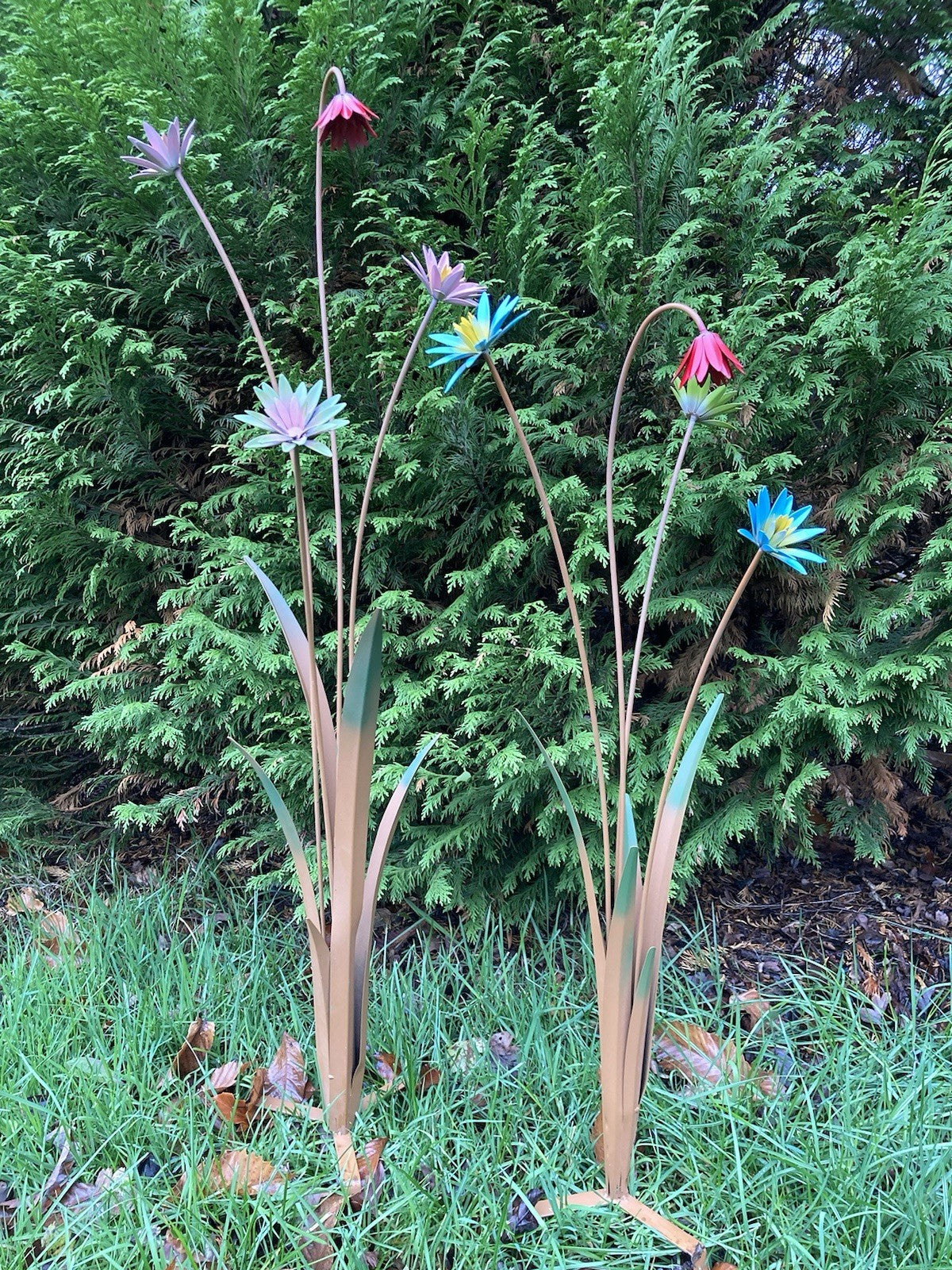Pair of Coloured Metal Daisy Flower Cluster Garden Stake Ornaments