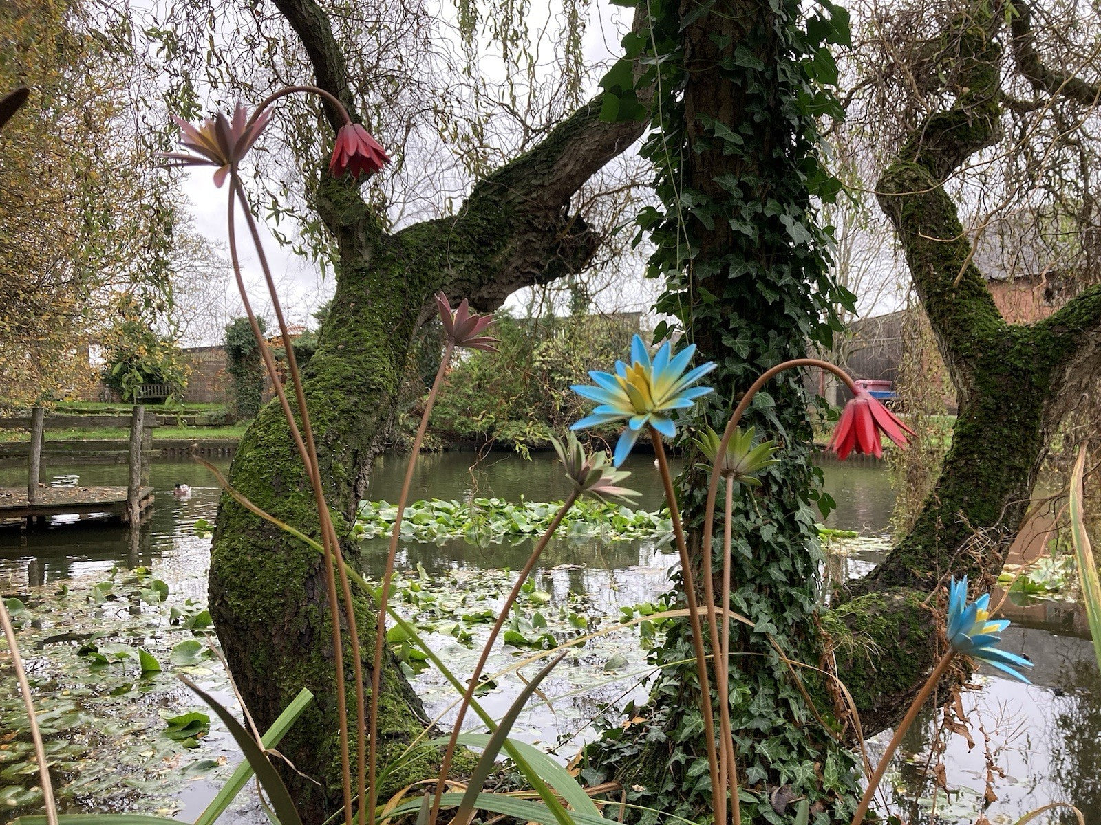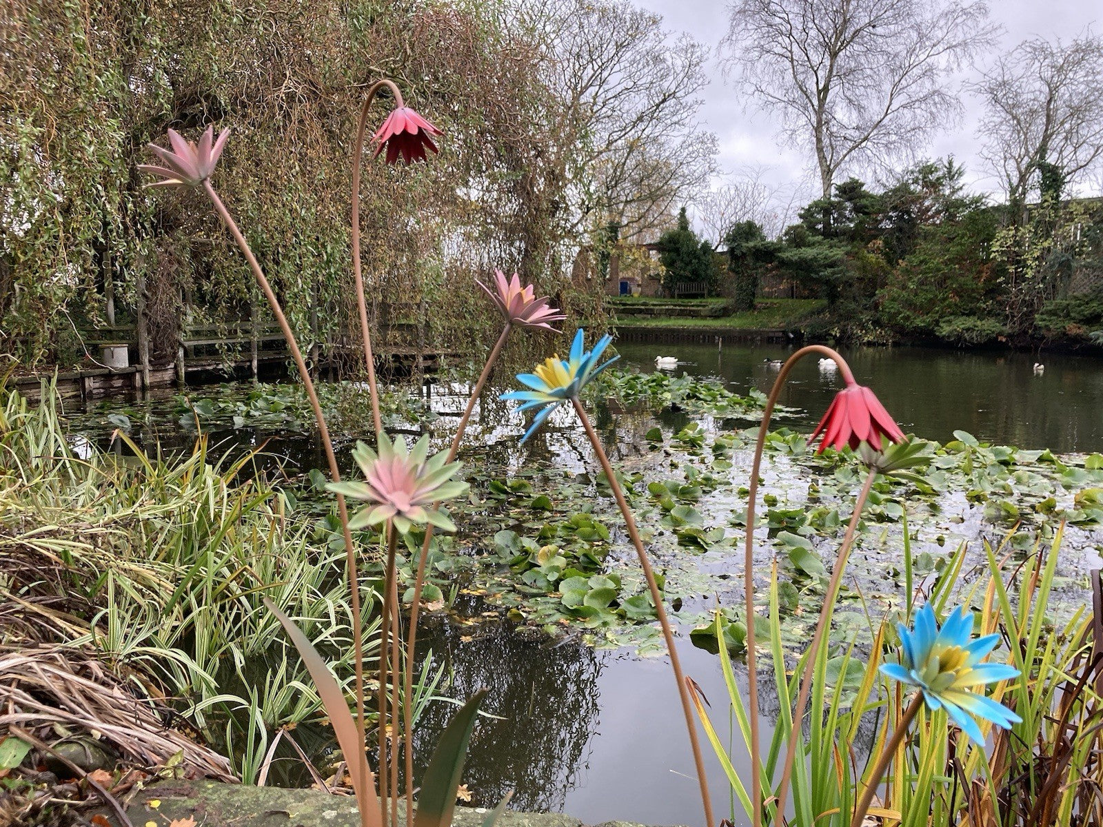 SET OF 2 COLOURED METAL DAISY FLOWER SPRAY STAKE GARDEN ORNAMENTS
