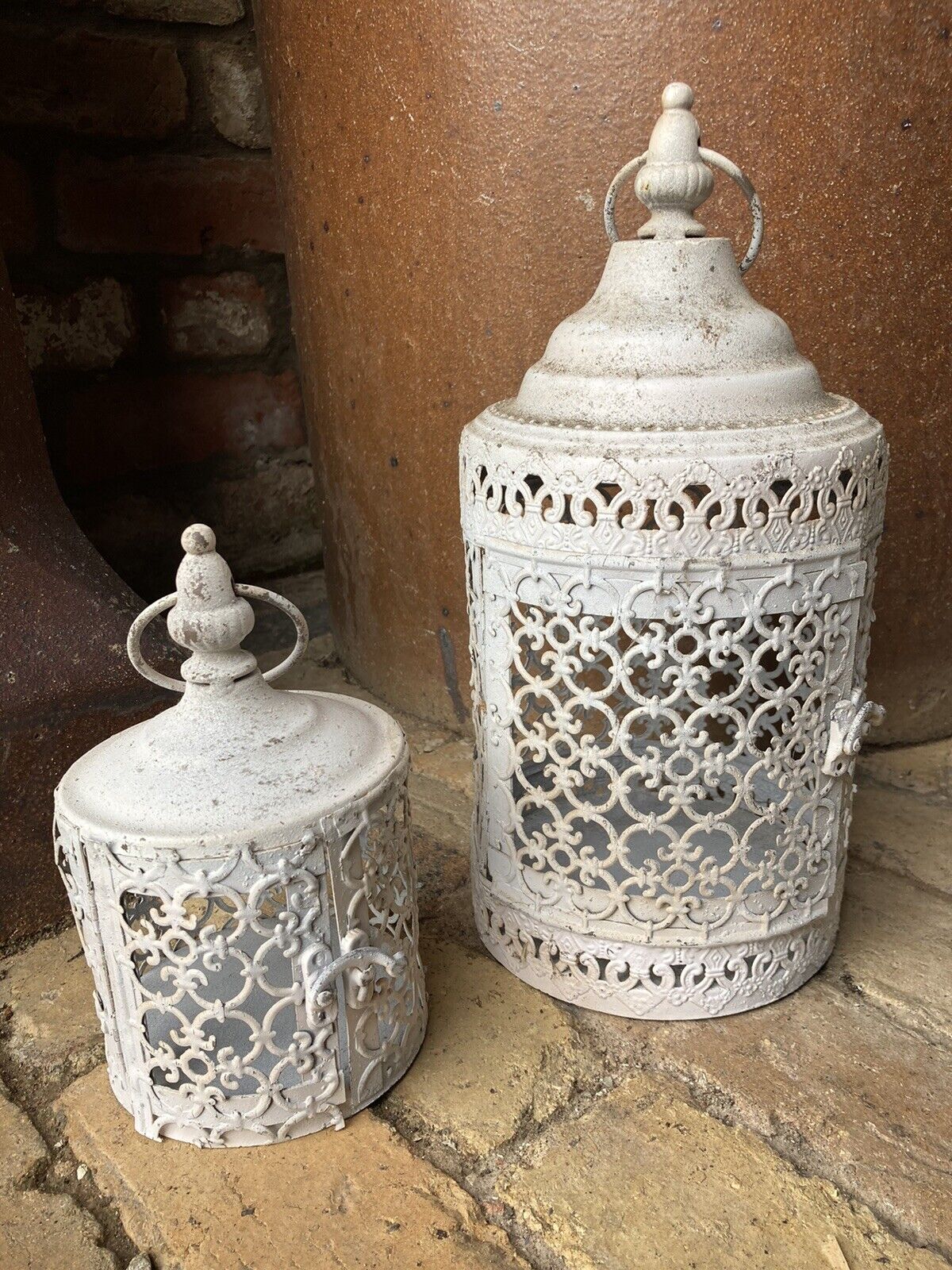 SET OF 2 FILIGREE WHITE METAL HANGING LANTERNS