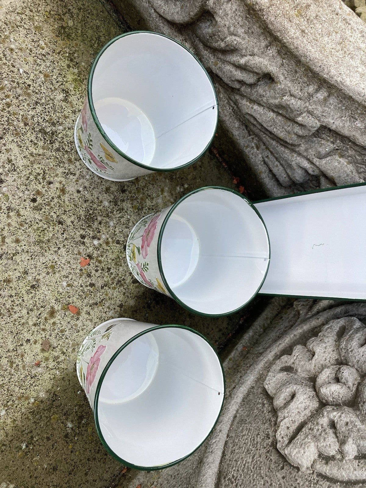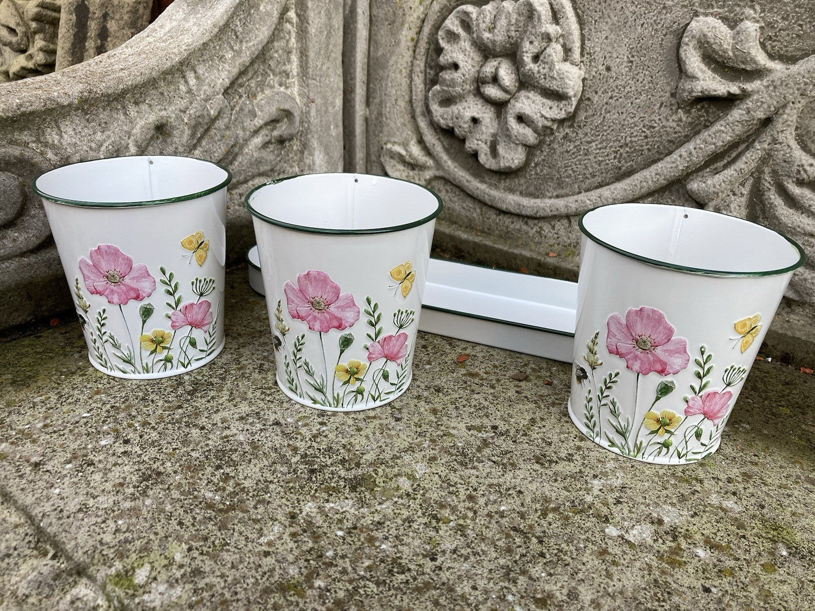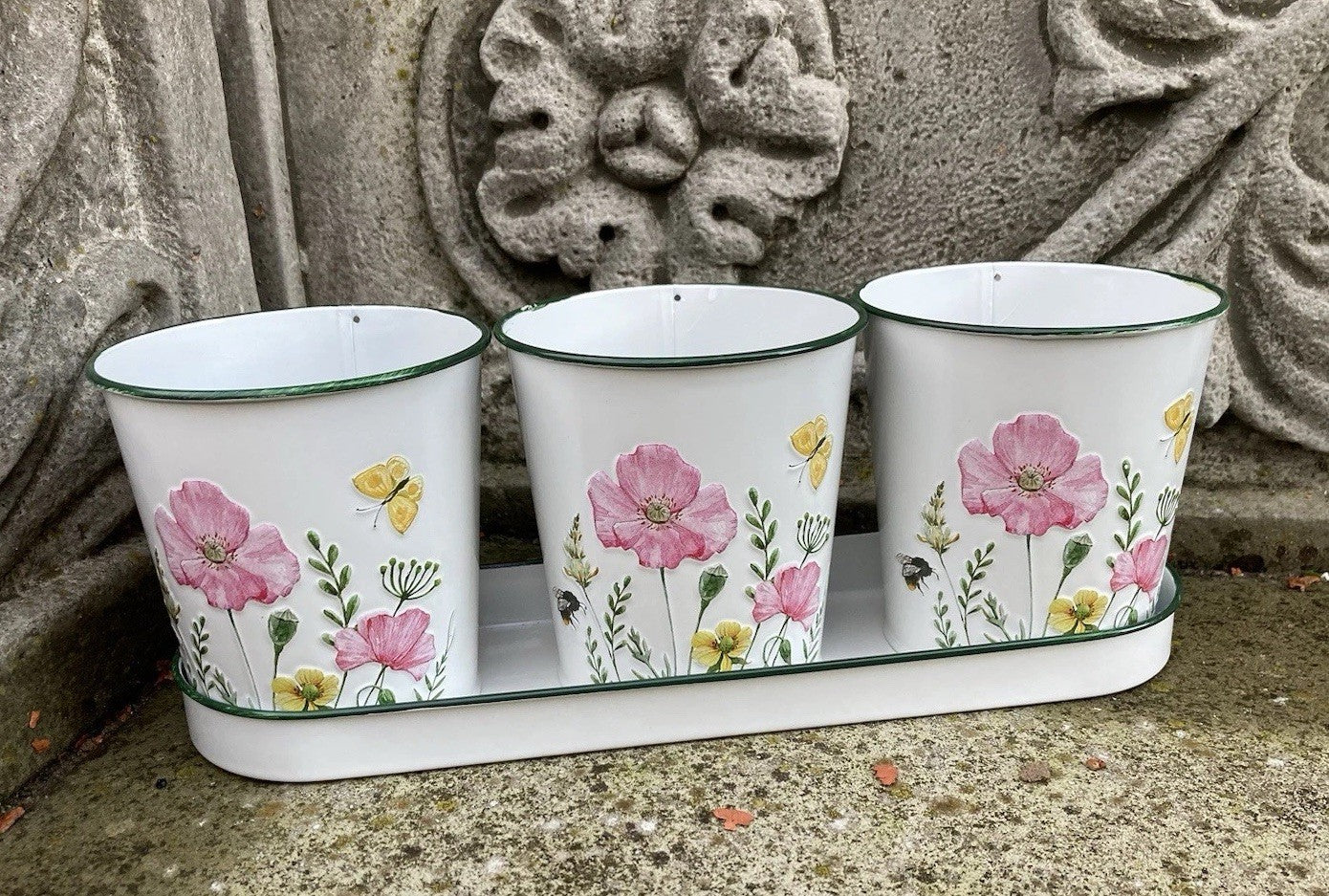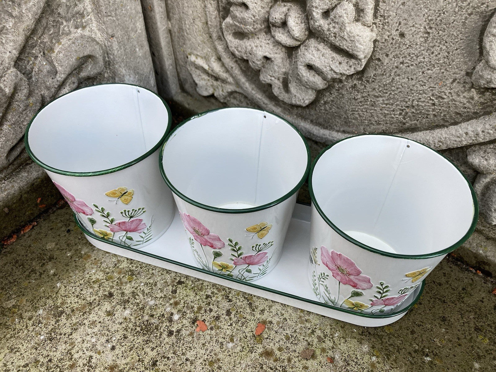 SET OF 3 METAL FLORAL ENAMEL HERB POTS PLANTERS ON TRAY GARDEN / INDOOR