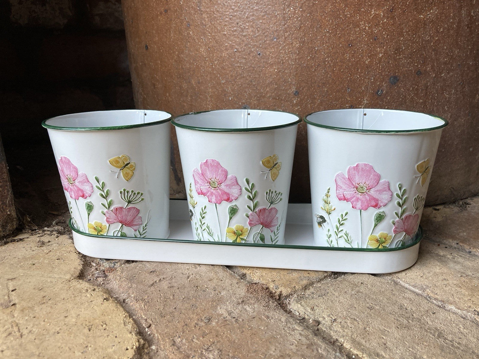 SET OF 3 METAL FLORAL HERB POTS PLANTERS ON TRAY