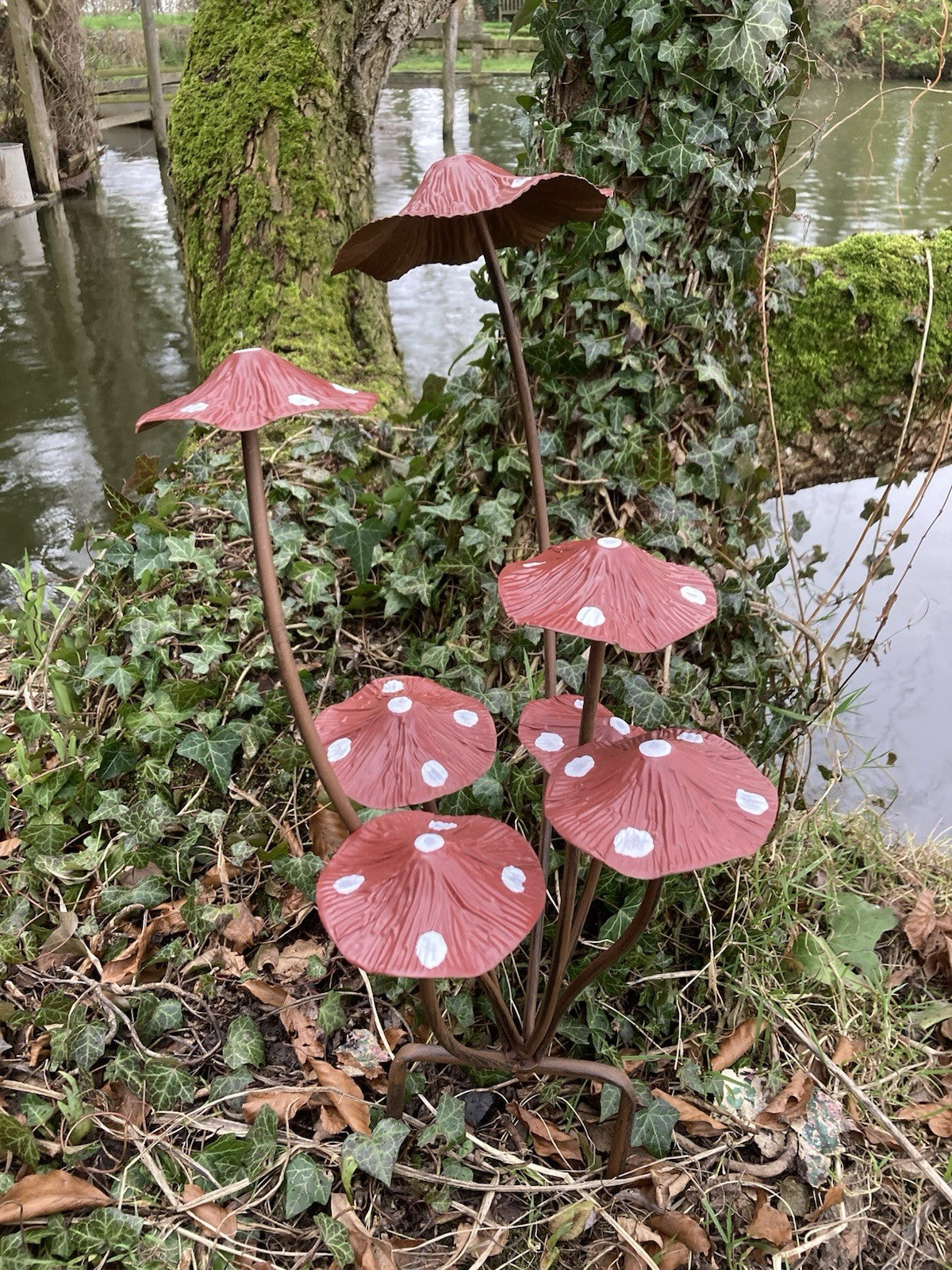 SPOTTY RED METAL TOADSTOOL / MUSHROOM 7 CLUSTER FAIRY STAKE GARDEN ORNAMENT