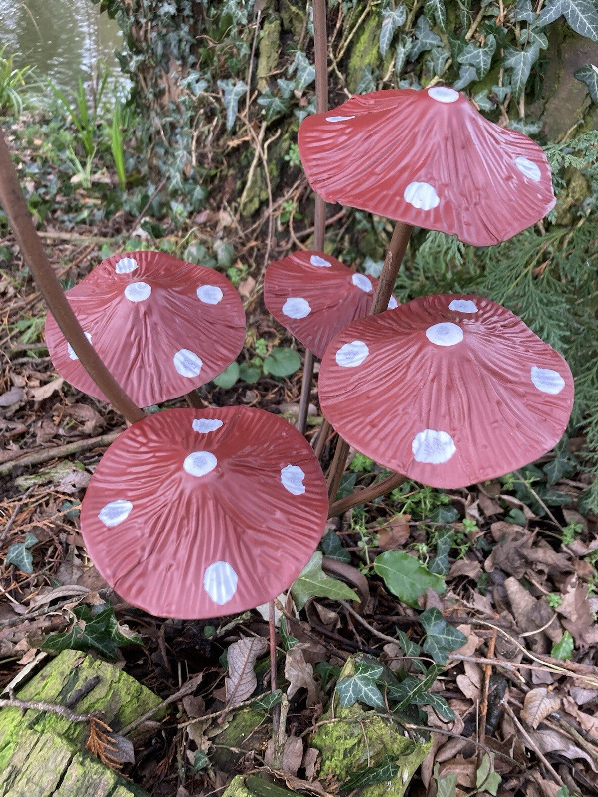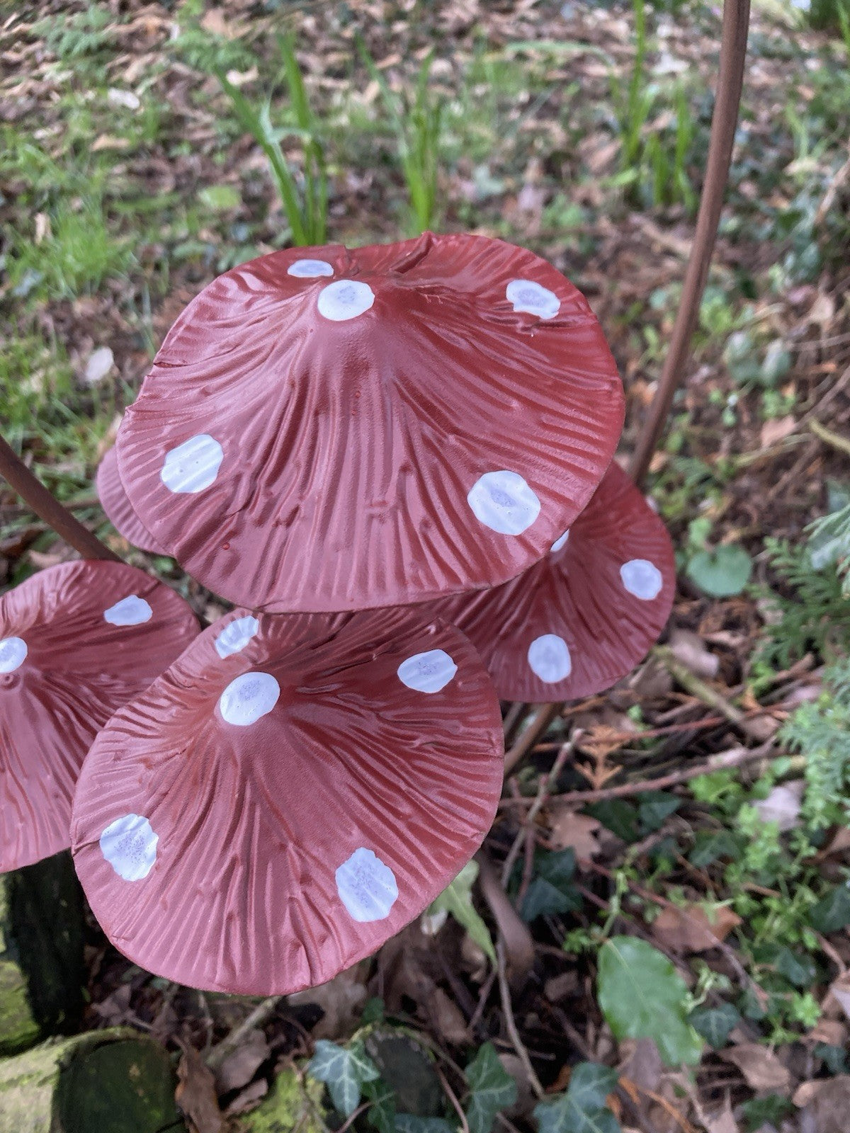 Painted Red Spotty Metal Toadstool / Mushroom 7 Cluster Garden Stake