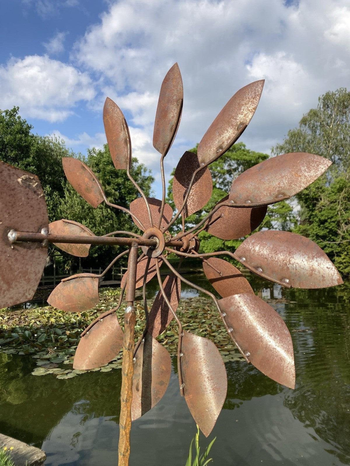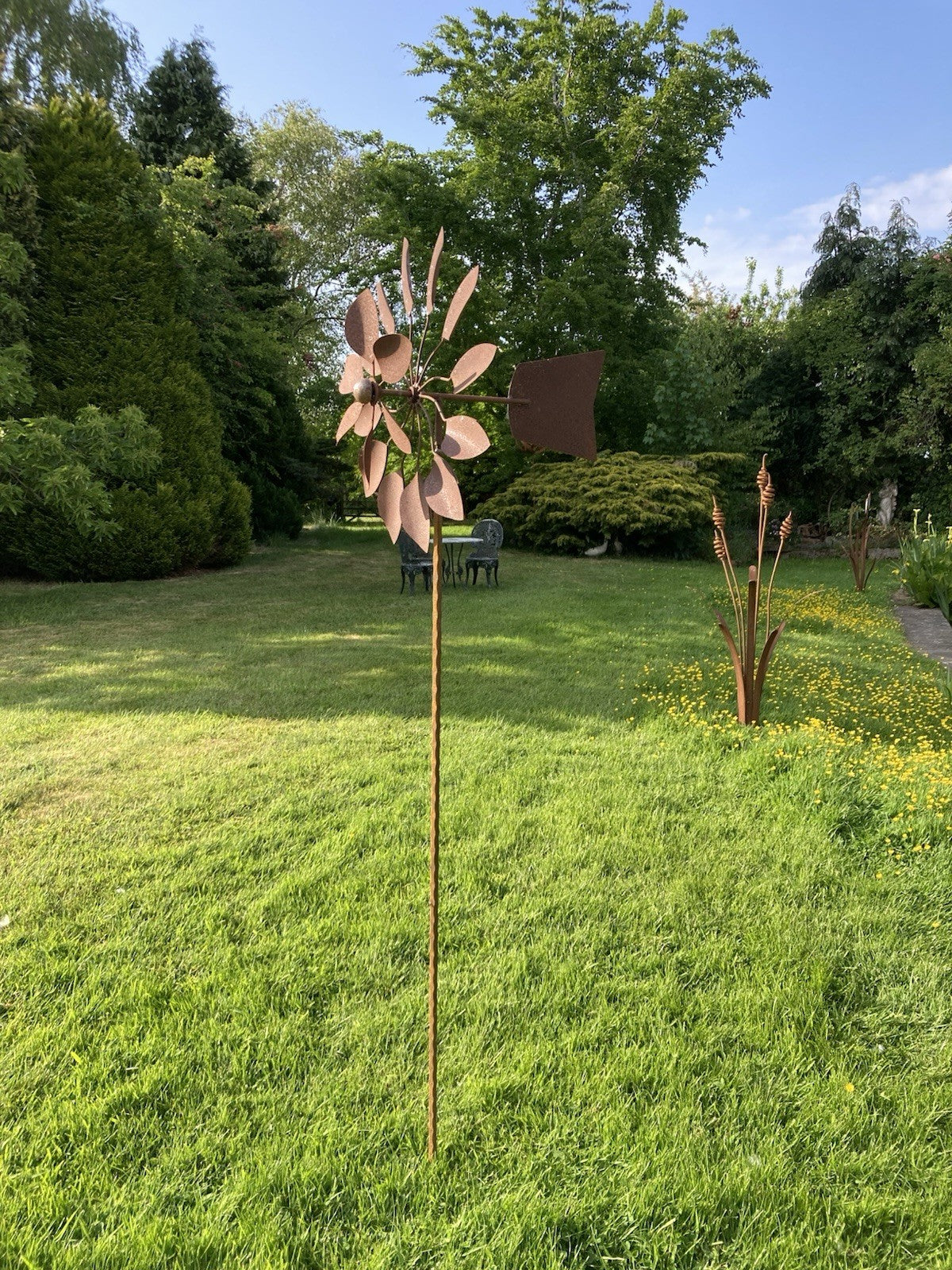 TALL METAL GARDEN RUSTY WIND SPINNER STAKE SCULPTURE ORNAMENT